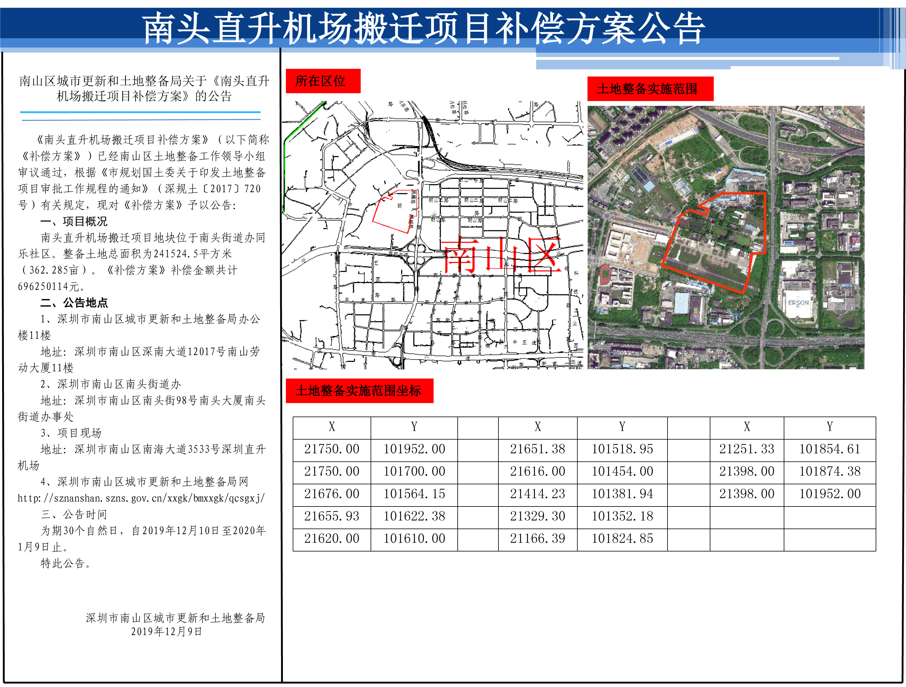 《南头直升机场搬迁项目补偿方案》(以下简称《补偿方案》)已经南山区土地整备工作领导小组审议通过,根据《市规划国土委关于印发土地整备项目审批工作规程的通知》(深规土〔2017〕720号)有关规定,现对《补偿方案》予以公告: