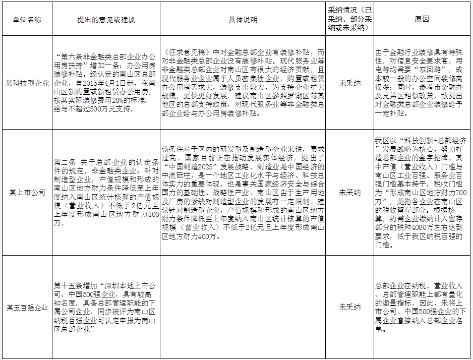 2018年4月2日,深圳市南山区经济促进局发布关于《南山区鼓励总部企业发展实施办法(试行)》公开征求意见的通知,征求社会各界和广大市民的意见和建议。截止2018年4月9日(征求意见截止时间),已收到部分群众反馈的意见,现针对群众反映的主要问题作出如下回应: