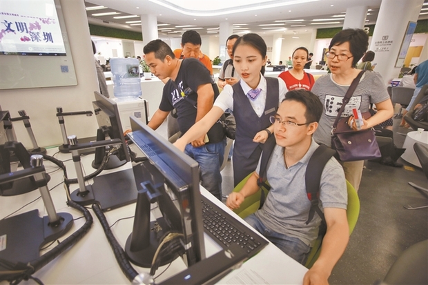人才是发展保障。新大厅一楼在中心位置设立了人才服务专区,专门为辖区“领航人才”、在职人才、高校毕业生等提供各类人才服务。前不久,市民胡梅携带22名深大教师的材料来办理“领航人才”认定业务。由于申请数量较大,为避免办事人来回奔波、耗时耗力,新大厅立即增派人手,由3名办事专员共同办理,只用了近2小时就完成了原本需要一天时间才能办理完的业务。