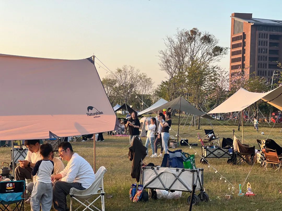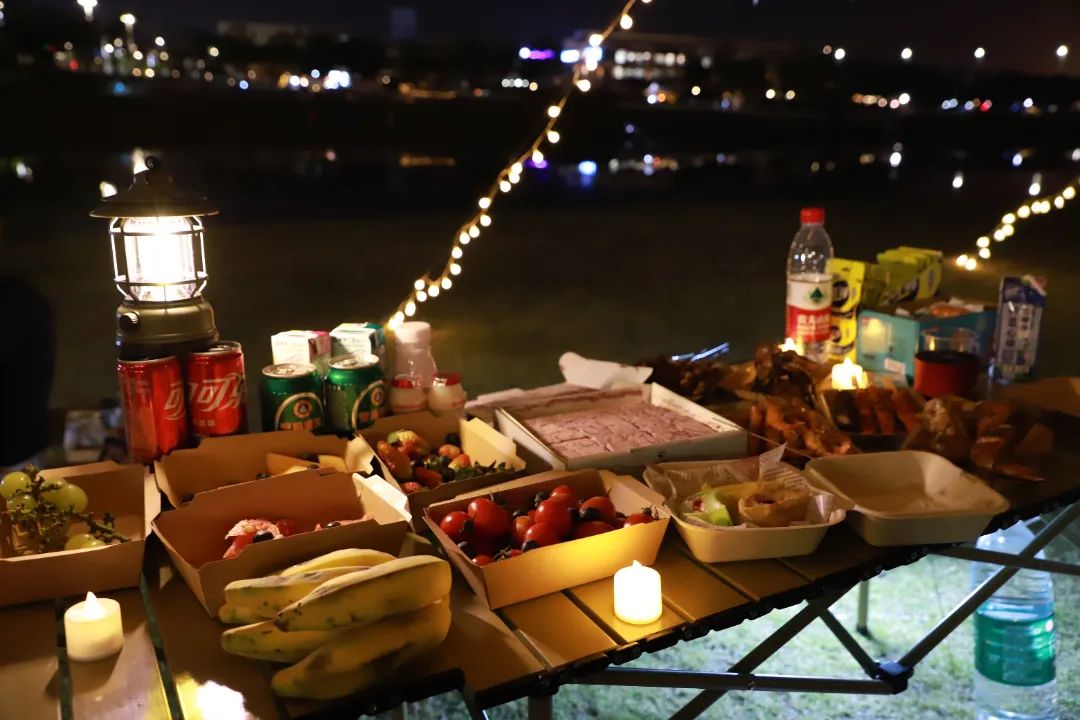 越近黄昏时刻,草坪上露营的人也越多了起来。围炉煮茶、烧烤野餐,还有飘来阵阵的咖啡香……美食伴着美景,别有一番滋味。