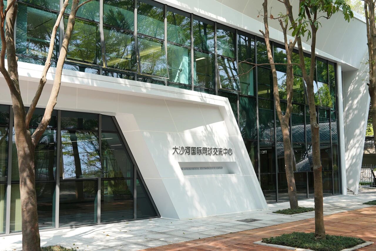 大沙河国际网球交流中心位于大沙河公园内,场馆以"现代极简、绿色环保、低碳理念"为设计理念,建设有配套用房1000平方米(包括3片室内羽毛球场),网球场面积6400平方米(8片室外场地),整体设计风格以现代极简为主,线条简洁明快,色彩搭配和谐,场地借鉴中国网球公开赛(中网)的风格,是集国际化、高标准为一体的运动场地。