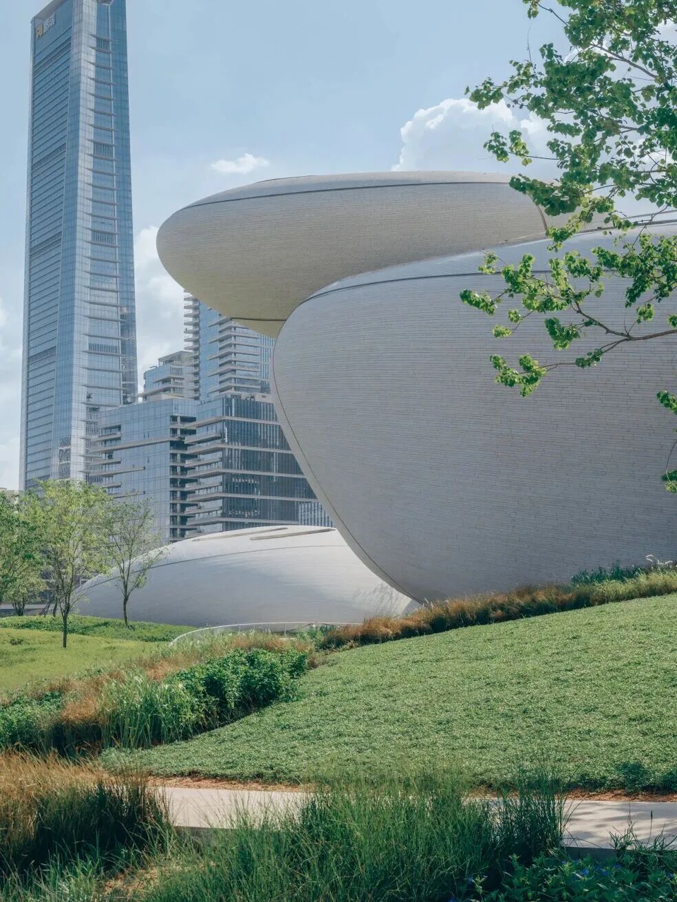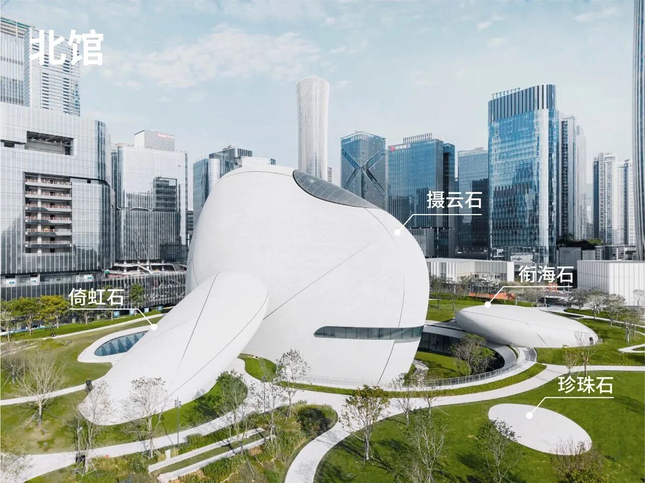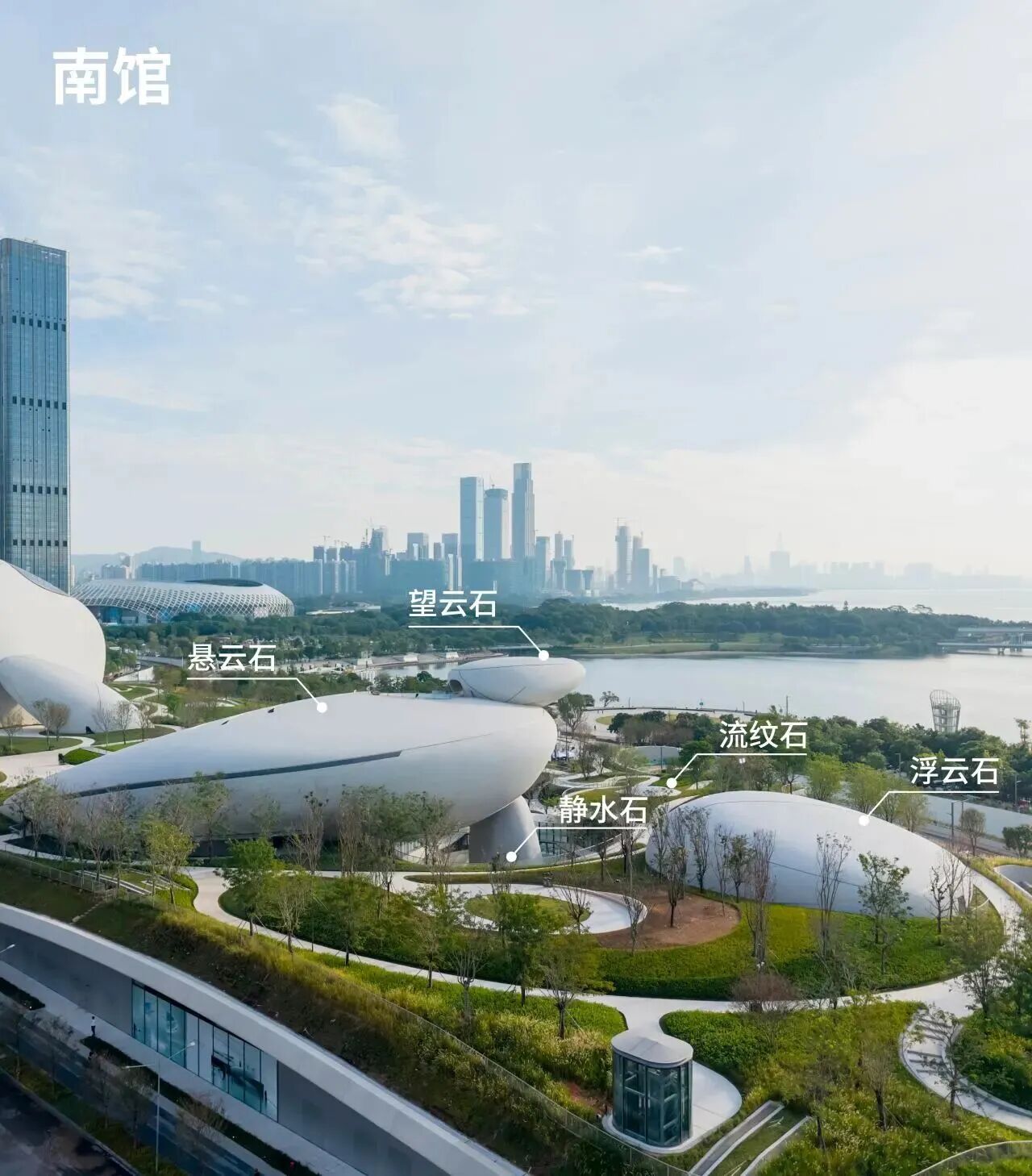 深圳湾文化广场,分为地上四层,地下三层,总建筑面积约为18万平方米。9座“石头”状建筑的设计灵感来源于海边的原石:摄云石、悬云石、望云石……它们错落分布在城市与海湾之间,象征着深圳湾的潮汐、海风与流云。